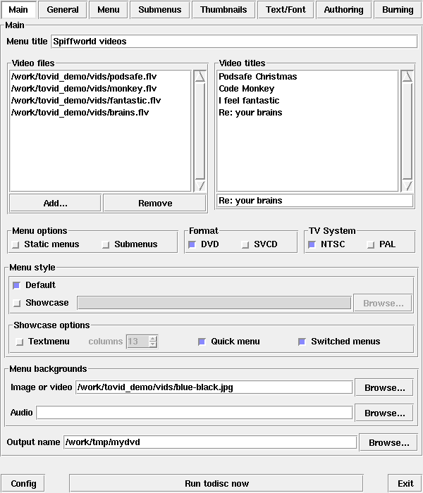 Below is a screenshot of the todisc gui. Starting with tovid 0.32 it will be known as tovidgui fancy, and the old tovidgui will be tovidgui simple.